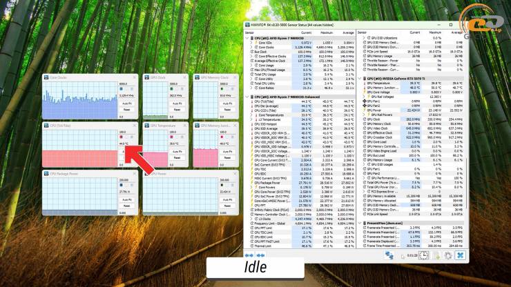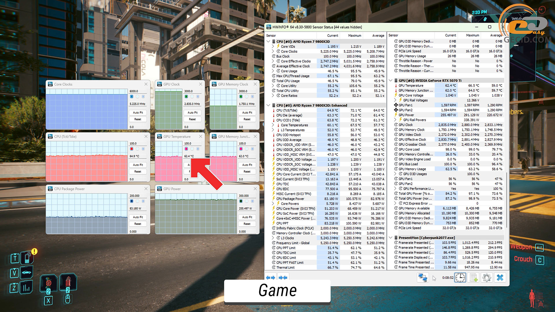 На прикладі Cyberpunk 2077 можна побачити, що при ігровому навантаженні відеокарта гріється на 5 градусів менше ніж у бенчмарку, а робочі частоти збільшуються приблизно на 200 МГц. У свою чергу навантаження на процесор тут не таке високе, тому його температура коливаються від 65 до 66 градусів.