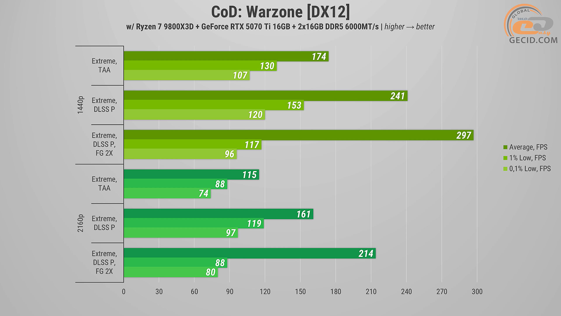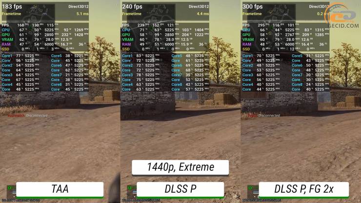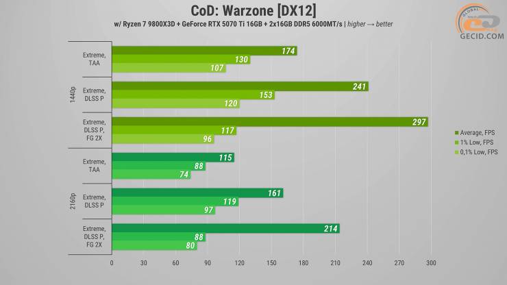 У Call of Duty: Warzone на екстремальному пресеті графіки в роздільній здатності Quad HD ігролад під час перебіжок по Верданську залишається на абсолютно достатньому рівні. Активація апскейлеру підвищує частоту оновлення екрану до 240 кадрів за секунду. А при використанні двократного генератора кадрів впираємося в ліміт рушія по частоті кадрів та зупиняємося на рівні у 300 FPS.