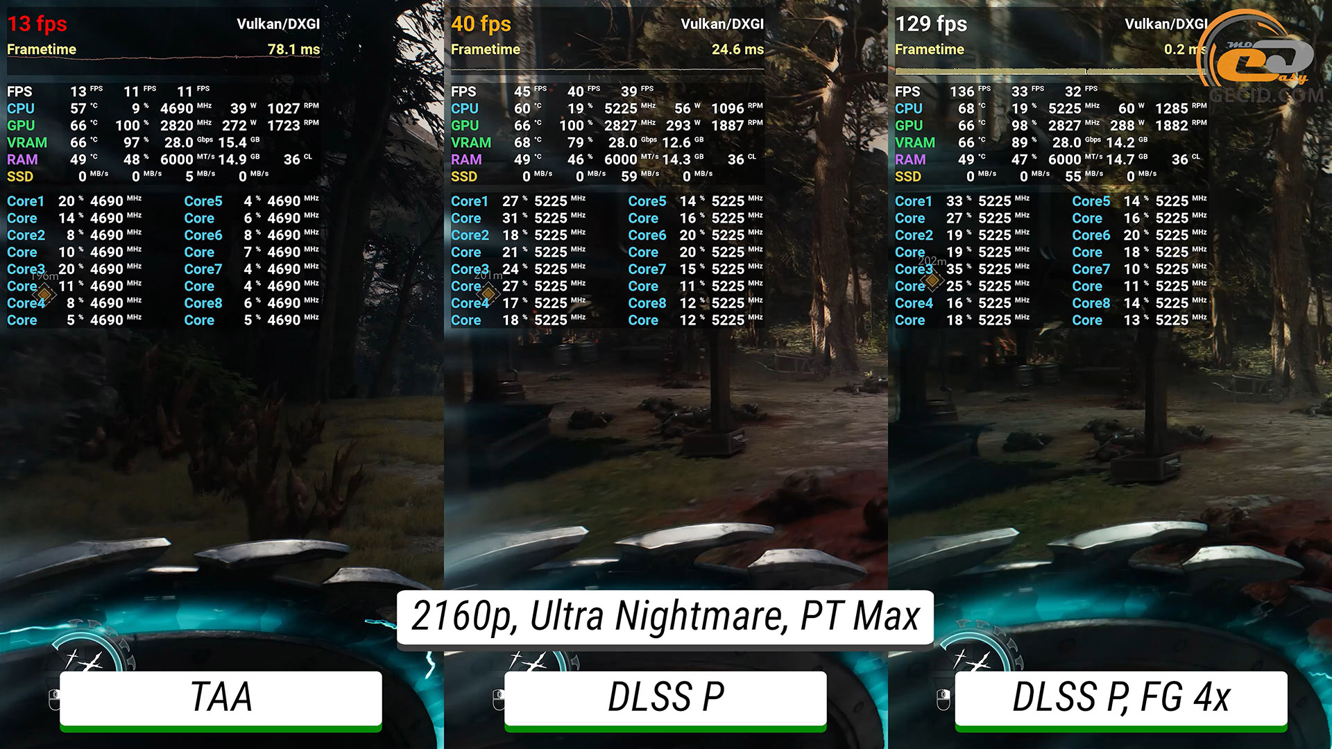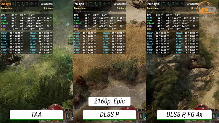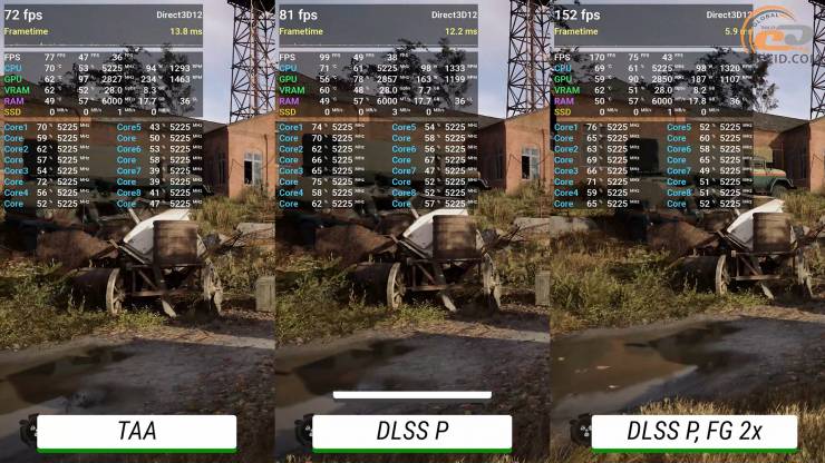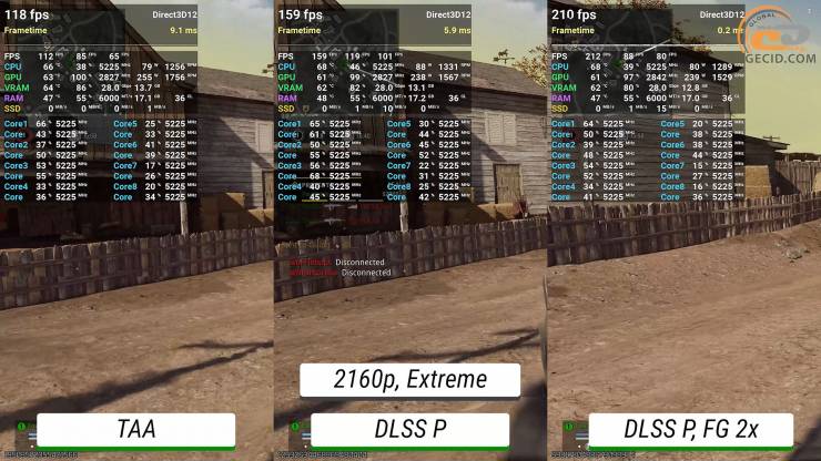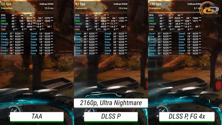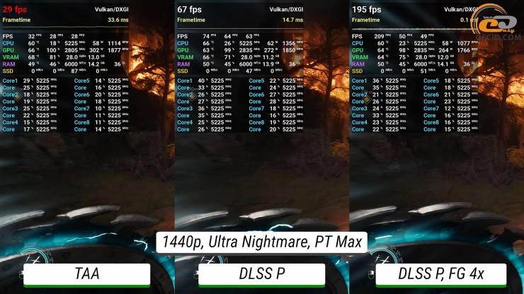 Максимальне трасування шляху стає вже майже непідйомним для графічного прискорювача без додавання будь-яких технологій прискорення — ледве виходить мати 30 FPS. Після активації DLSS в продуктивному режимі ігролад стає приємним, а після перемикання фрейм-генератору у 4X система дозволяє отримати понад 200 FPS, при цьому мати ідеальне керування і не дуже відмінну від оригінальної картинки.