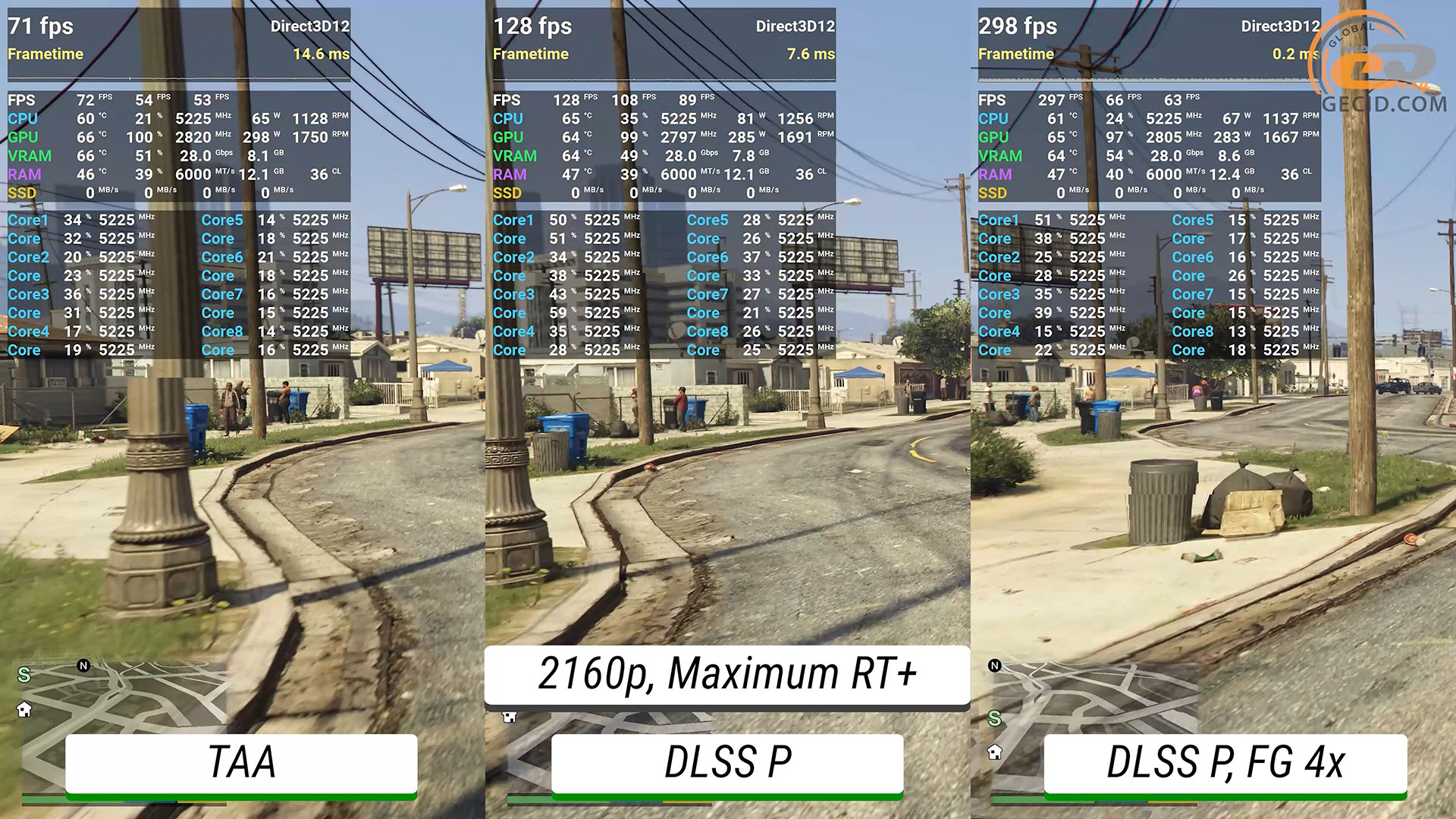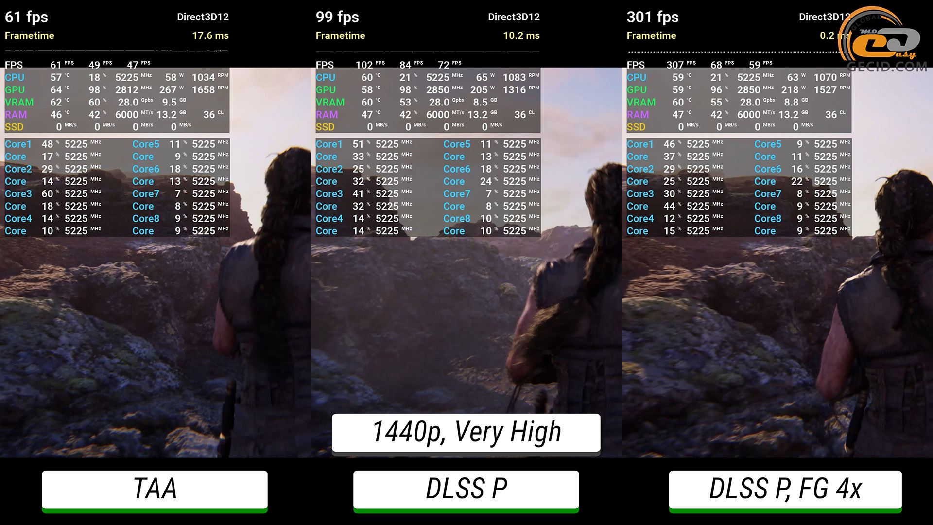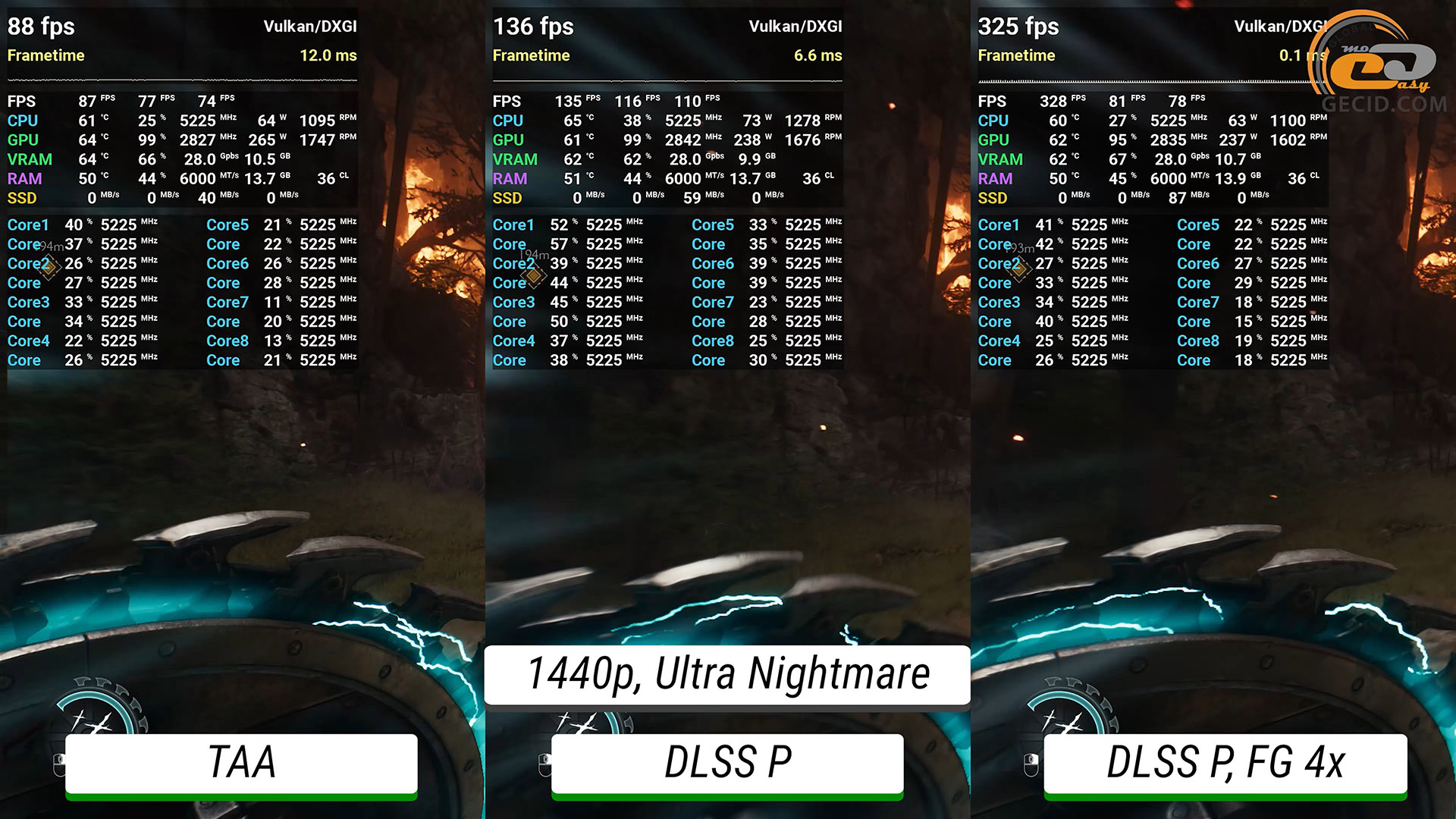 Максимальне трасування шляху стає вже майже непідйомним для графічного прискорювача без додавання будь-яких технологій прискорення — ледве виходить мати 30 FPS. Після активації DLSS в продуктивному режимі ігролад стає приємним, а після перемикання фрейм-генератору у 4X система дозволяє отримати понад 200 FPS, при цьому мати ідеальне керування і не дуже відмінну від оригінальної картинки.