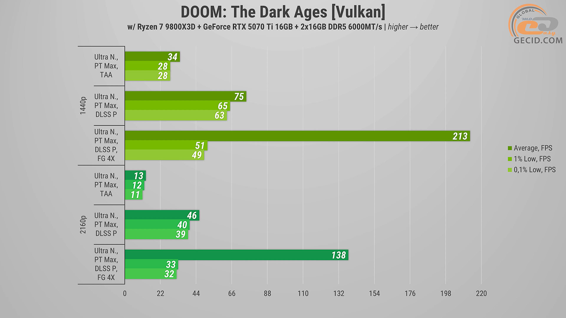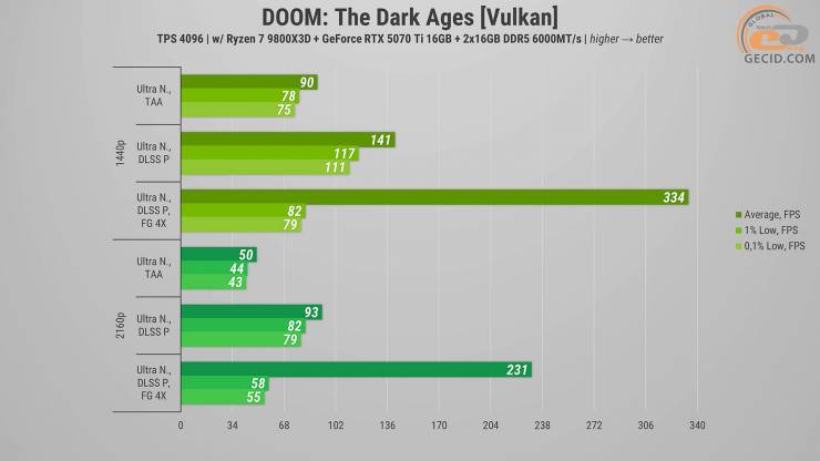 Рубити ворогів в DOOM: The Dark Ages в 1440p та максимально доступному пресеті графіки «Ультра Кошмар» можна із задоволенням при будь-якому розкладі — продуктивності відеокарти цілком вистачає і без DLSS. Активація ж апскейлеру очікувано прискорює рендер майже в півтора разів. А чотирикратний генератор кадрів виводить частоту оновлення екрану на рівень понад 300 разів за секунду.