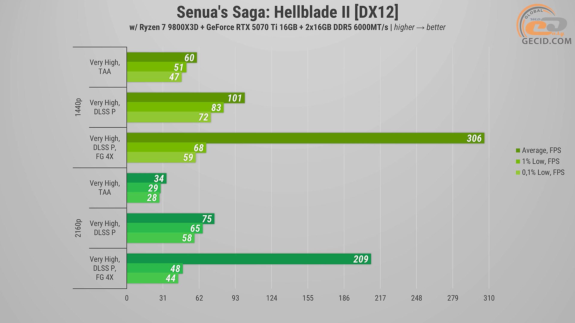 На нещодавно доданому Very High пресеті графіки побігати у Senua's Saga: Hellblade II можна і при нативній картинці, проте частота кадрів не завжди стабільно залишається на рівні 60 — подеколи зустрічаються короткі посмикування чи просідання. В обох випадках з доданим DLSS4 і генератором кадрів інноваційні технології дозволяють отримати максимум задоволення від процесу гри.