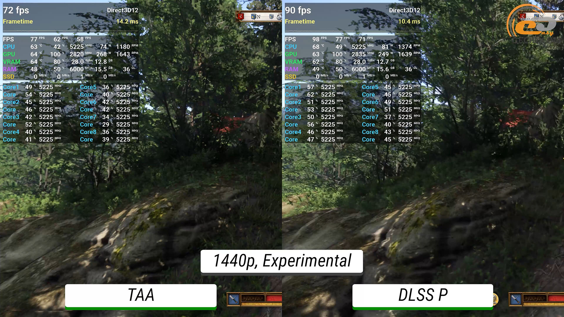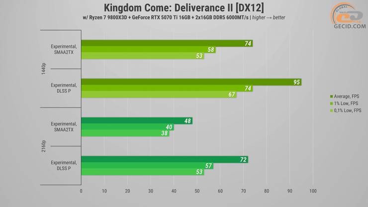 У Kingdom Come: Deliverance II можна застосувати найважчий і умовно нерекомендований експериментальний пресет графіки. В густому лісі, наприклад, в таборі ромів, геймплей комфортний, хоча частота кадрів іноді і намагається опуститися до «мінімальних» 60 FPS. А з доданням DLSS у режимі Transformer одразу помічаємо кращу деталізацію рослинності та невеличких елементів, особливо вдалині, а також помітно кращу чіткість. На жаль, гра повноцінно не підтримує генератор кадрів і не дозволяє протестувати в ній його можливості.