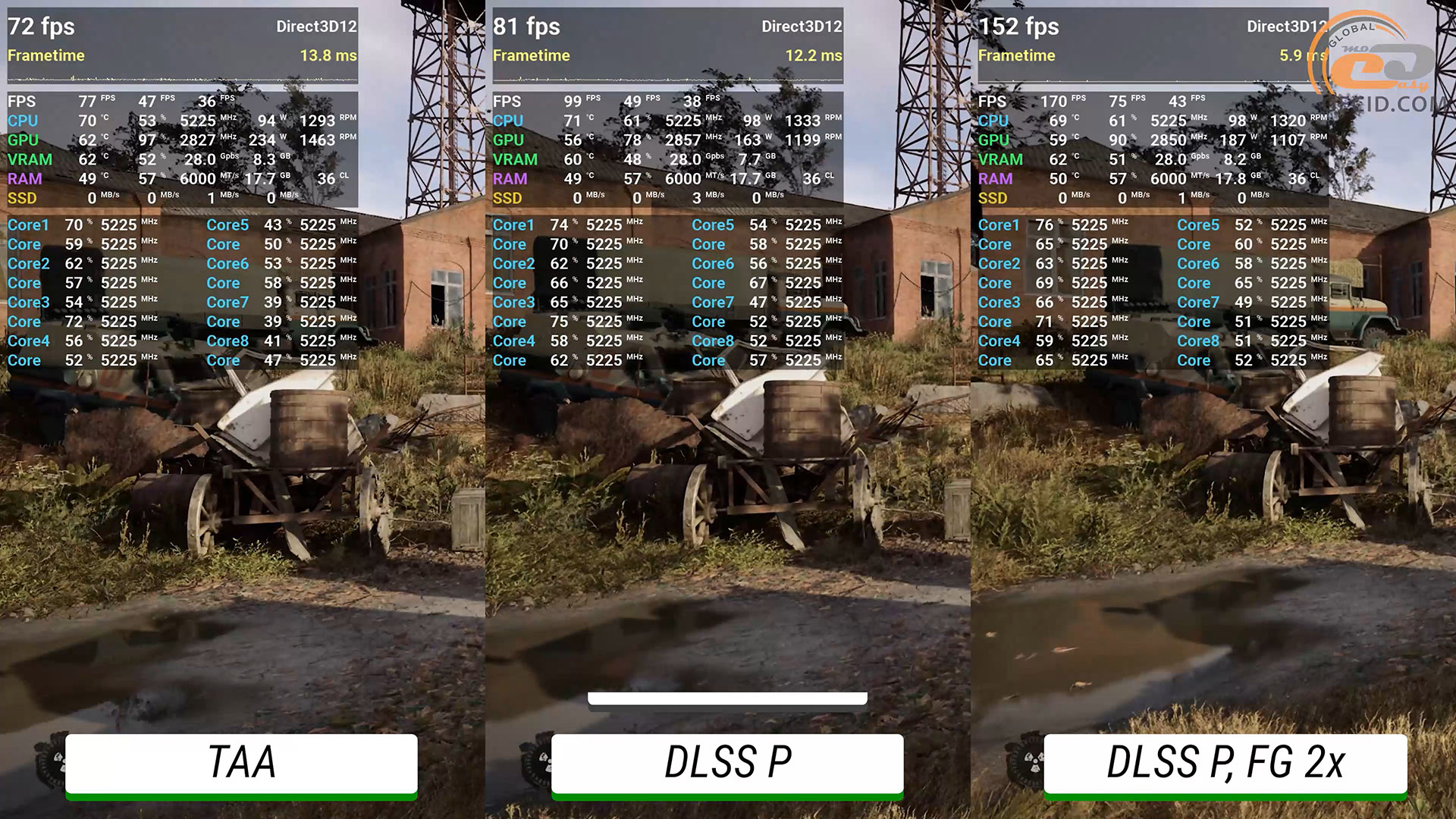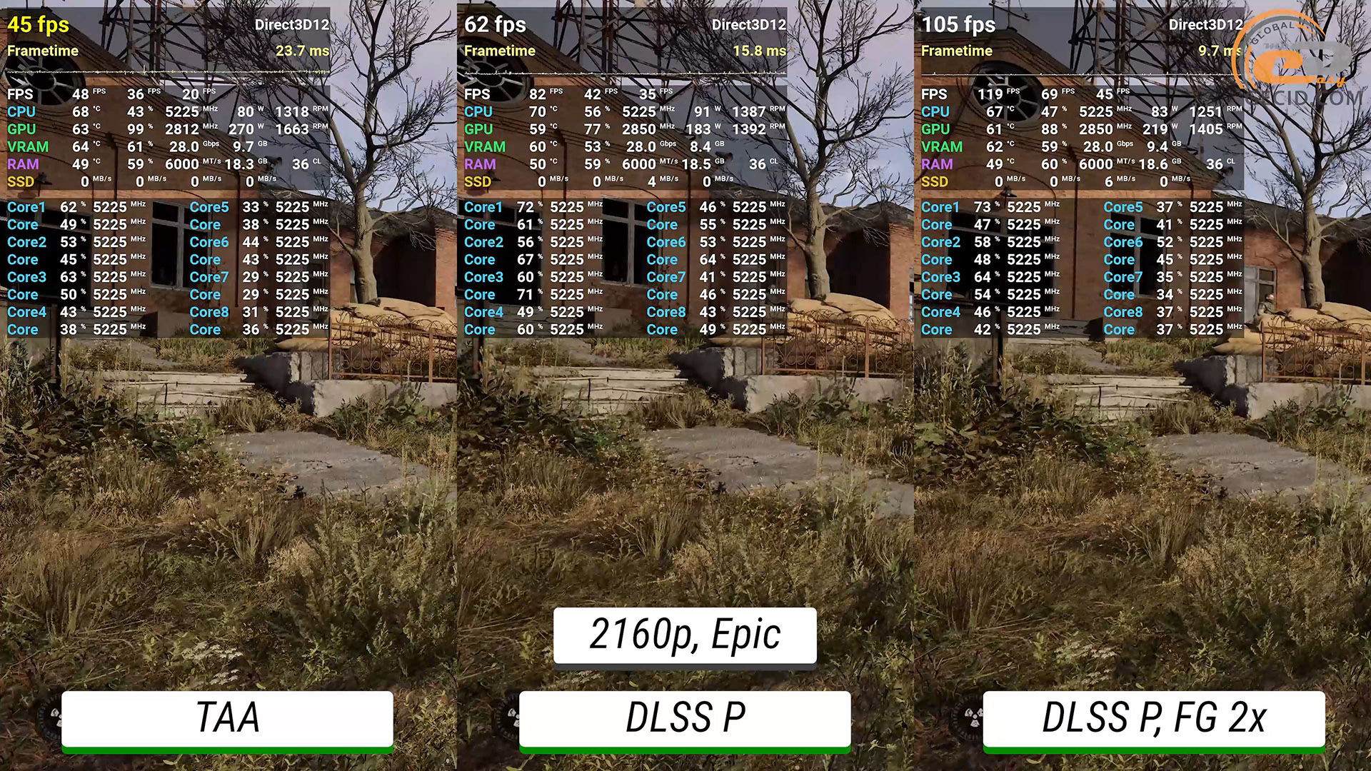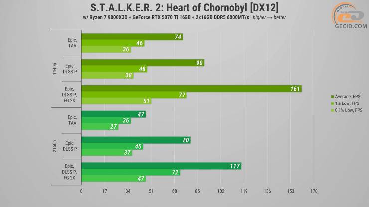 В S.T.A.L.K.E.R. 2: Серце Чорнобилю на епічних налаштуваннях при 1440p навіть в нативній роздільній здатності ігровий процес досить комфортний. Звісно, є певні проблеми з продуктивністю та плавністю, особливо у локаціях в чималою кількістю NPC. І це, нажаль, є «нормальним» станом гри. З продуктивним DLSS частота кадрів стає більшою, а загальна плавність трохи поліпшується, проте негаразди не зникають повністю. Хоча гра і підтримує лише двократну генерацію кадрів відеоряд усе одно виглядає плавним та не дуже «зіпсованим».