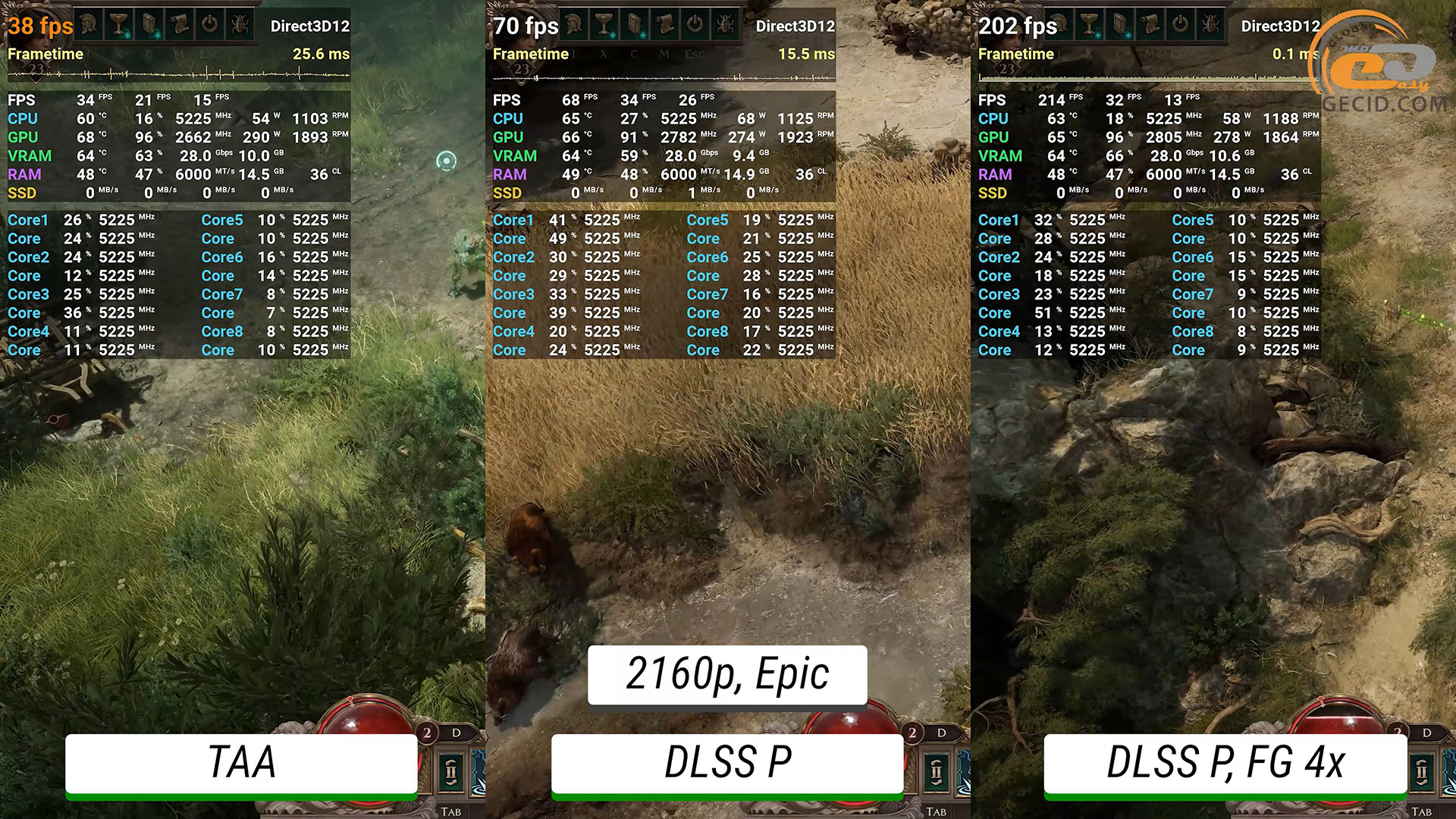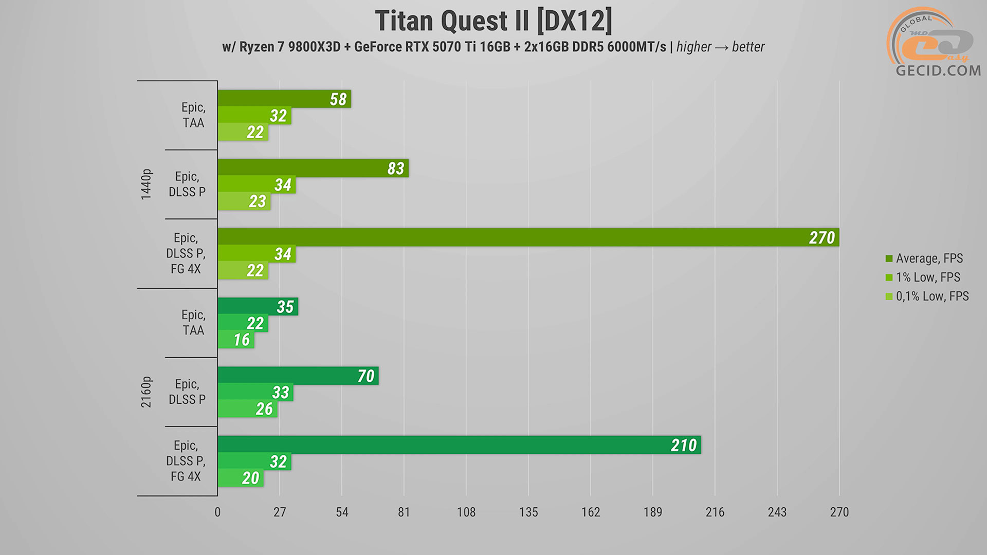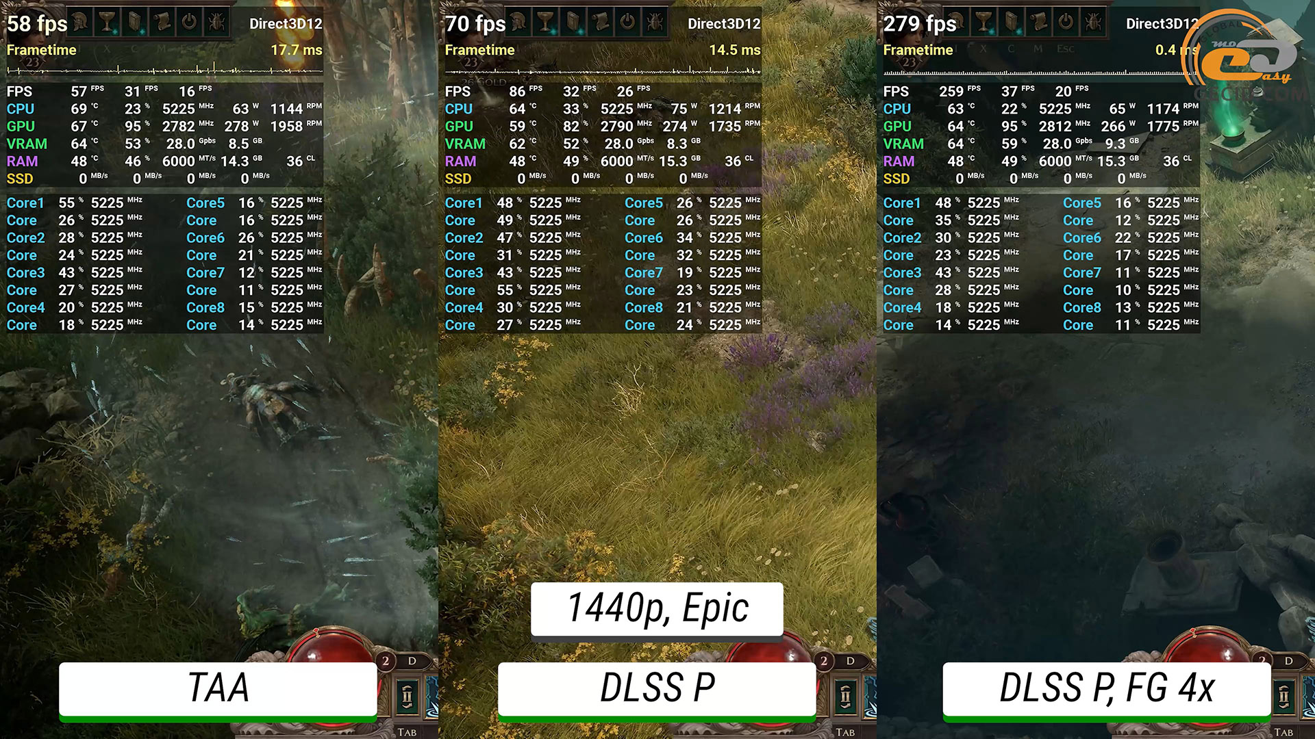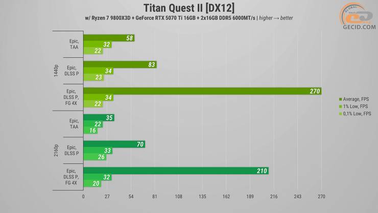 Також цікаво подивитися на продуктивність у новій RPG Titan Quest II. На епічних і максимально доступних налаштуваннях графіки інколи простежуються певні проблеми з оптимізацією, на які розробникам ще потрібно звернути увагу. Це призводить до подеяких просідань нижче 50 FPS та коротких посмикувань. Активація DLSS не тільки надає додаткових кадрів, а й наче покращує візуальну сторону. А генератор кадрів придає грі додаткової плавності.