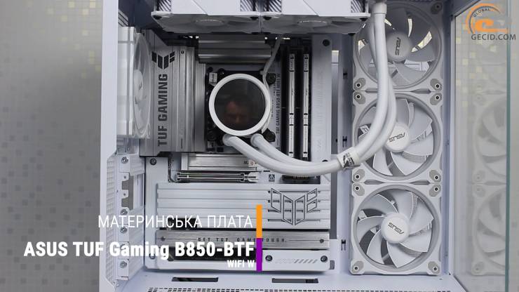 Основною зіркою збірки є материнська плата ASUS TUF Gaming B850-BTF WIFI W форм-фактору ATX - яскравий приклад того, як інноваційна інженерна ідея може змінити не лише зовнішній вигляд ПК, але й сам процес його складання. Модель належить до нового покоління рішень з концепцією BTF 2.0, головна фішка якої — перенесення більшості роз’ємів підключення на тильну сторону текстоліту.