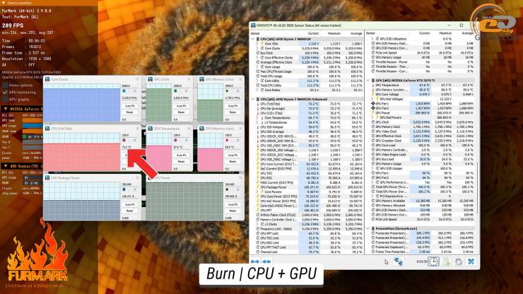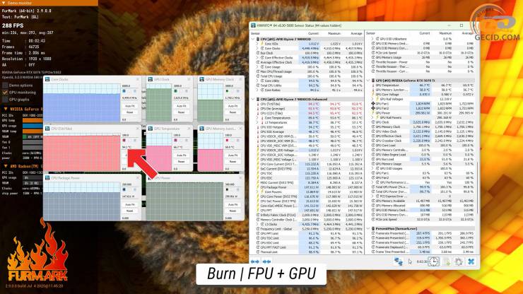 При доланні випробувань від FurMark з навантаженням FPU процесора та відеокарти, перший розігрівся до досить високого рівня у 94 градуси Цельсію. Щодо графічного прискорювача, то його температура набагато нижча — коло 66 градусів при робочій частоті в 2625 МГц, при 58-ми градусах на чипах відеопам’яті.