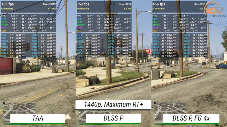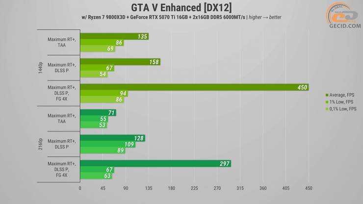 Покращена версія GTA V нещодавно отримала оновлення, в якому розробники додали підтримку DLSS4 і генерації кадрів до рівня 4X. Отже варто також подивитися, як тут себе почуває система. У процесі їзди через літній Лос-Сантос в Quad HD в усіх трьох випадках маємо абсолютно достатній запас частоти кадрів на максимальному пресеті графіки. Проте варто відмітити, що при доданні продуктивного режиму DLSS сильного приросту частоти кадрів не спостерігається, а от показник дуже рідкісних подій сигналізує про помітніші просідання та появу деяких посмикувань. А от генератор кадрів дозволяє отримати дуже плавну картинку з майже непомітними натяками на артефакти.