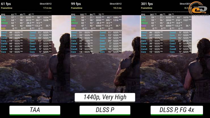 Продуктивний DLSS збільшує показники на 40%, а генератор кадрів практично подвоює середню частоту, хоча по довгим кадрам все повертається до рівня нативного режиму.