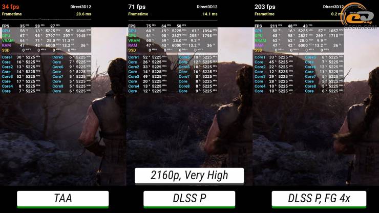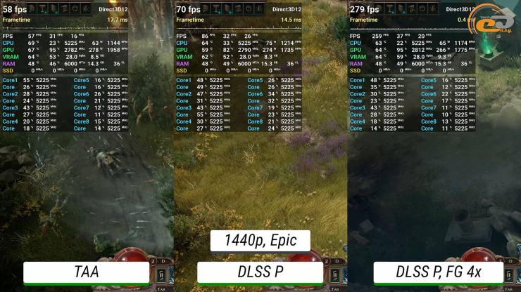 Проте тепер використання продуктивного режиму апскейлінгу помітніше покращує рівень продуктивності і дозволяє мати коло 120 середніх кадрів за секунду. Щодо фрейм-генератору, то після його активації ситуація стає зовсім ідеальною.