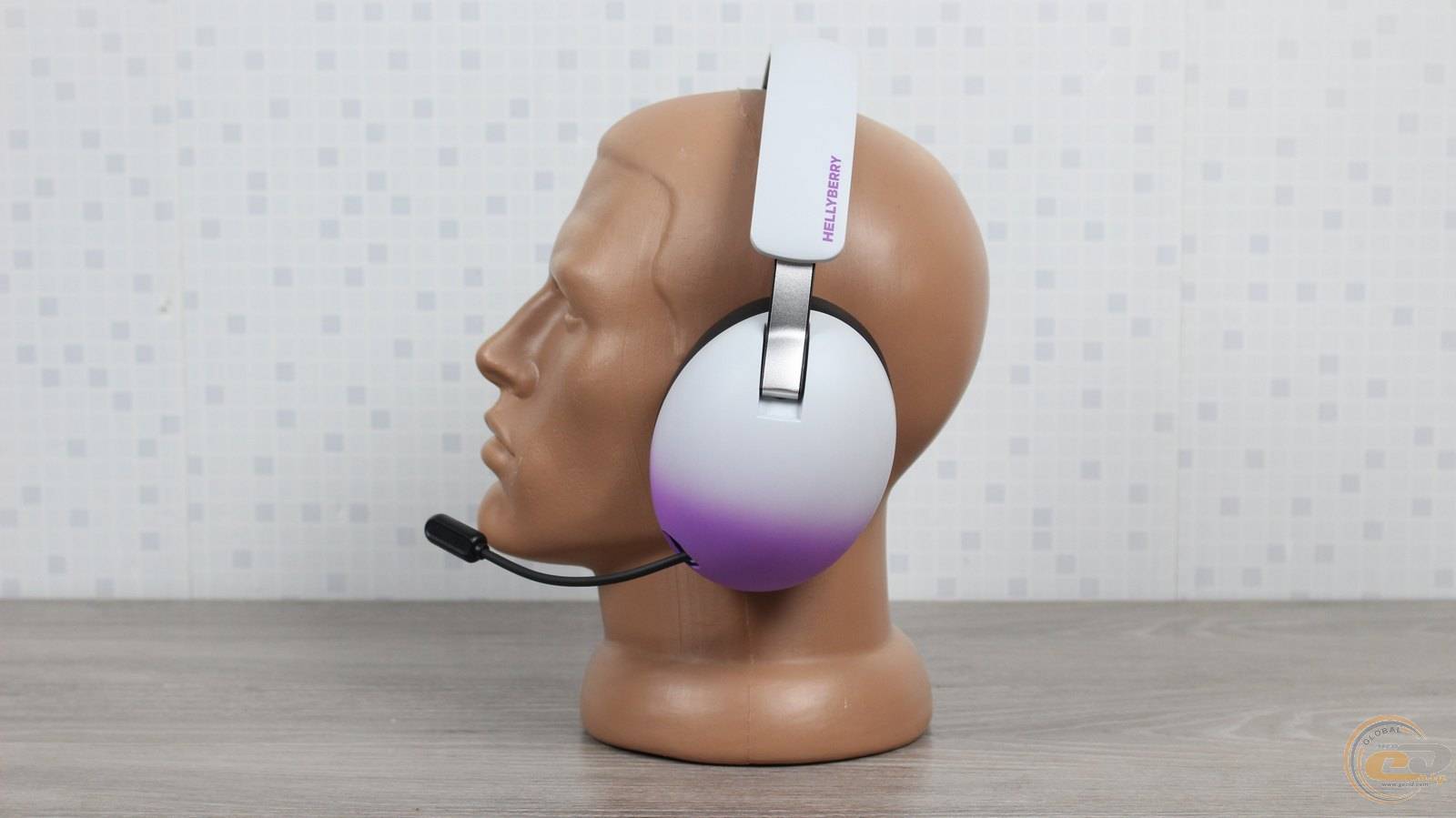 Це забезпечує комфорт навіть при тривалому носінні. На лівому боці розташовано напис Hellyberry у фіолетовому кольорі, а на правому — фірмовий логотип бренду. Така комбінація робить гарнітуру впізнаваною й підкреслює її стильову цілісність.