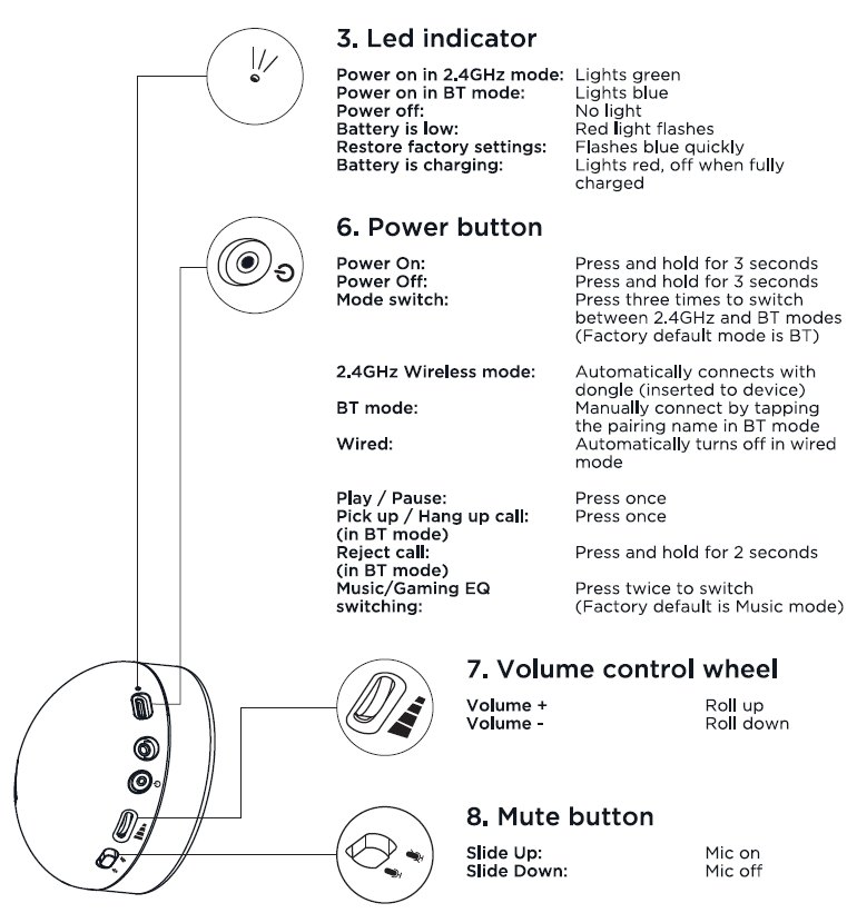 Поруч розташовані порти: USB Type‑C для заряджання та AUX 3,5 мм для дротового підключення. Тут усе стандартно та зрозуміло. LED‑індикатор виконує роль універсального сигналізатора: зелений означає 2,4 ГГц, синій — Bluetooth, червоний блимає при низькому заряді, а під час заряджання горить червоним і гасне після повного заряду. Під час скидання налаштувань у Bluetooth‑режимі через утримання кнопки Power протягом восьми секунд, індикатор починає швидко блимати синім.