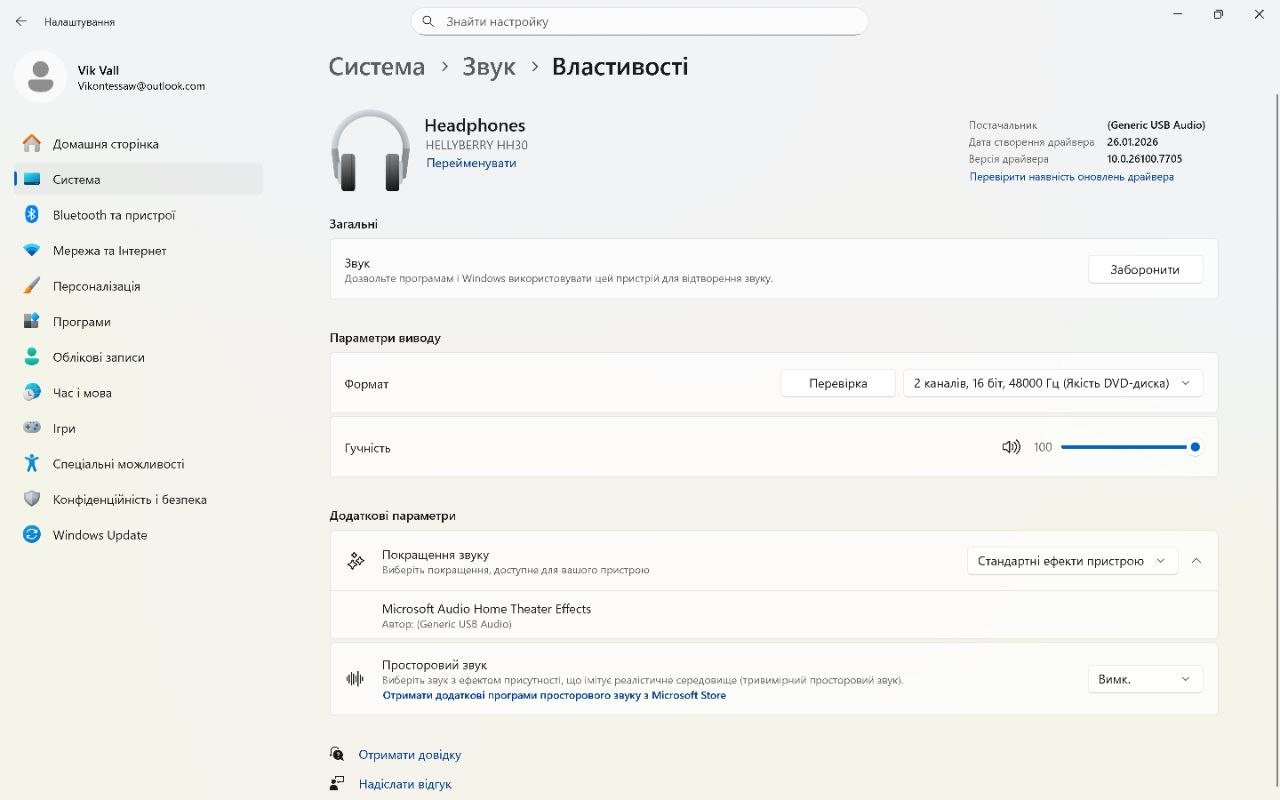 У Windows 11 гарнітура з’являється під назвою Hellyberry HH30, і це цілком очікувано, адже єдина різниця між моделями — амбушури. Радіоканал активується автоматично, щойно донгл вставлено в комп’ютер, тоді як Bluetooth доведеться налаштовувати вручну, як будь-який інший пристрій. Якщо ж підключити кабель 3,5 мм, бездротові інтерфейси відключаються, і гарнітура переходить у повністю аналоговий режим.
