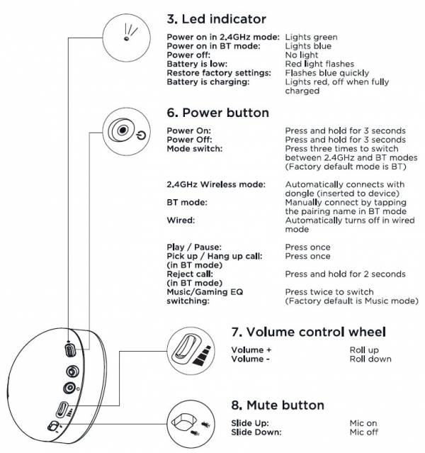 Центральним вузлом є кнопка живлення. Вона відповідає за ввімкнення й вимкнення, перемикання між режимами, зміну профілю еквалайзера, керування відтворенням, дзвінками та навіть скидання налаштувань.