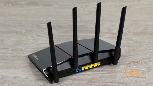 Сама насичена різними елементами саме тильна панель. Чого тільки варті чотири незнімні антени, які легко направити в бік клієнтів. Дві з них відповідають за діапазон 2,4 ГГц, а дві інші - за більш актуальний 5 ГГц, заради якого даний пристрій і купується. Для порівняння: дорожчий ASUS RT-AX56U має в своєму розпорядженні тільки пару таких елементів.