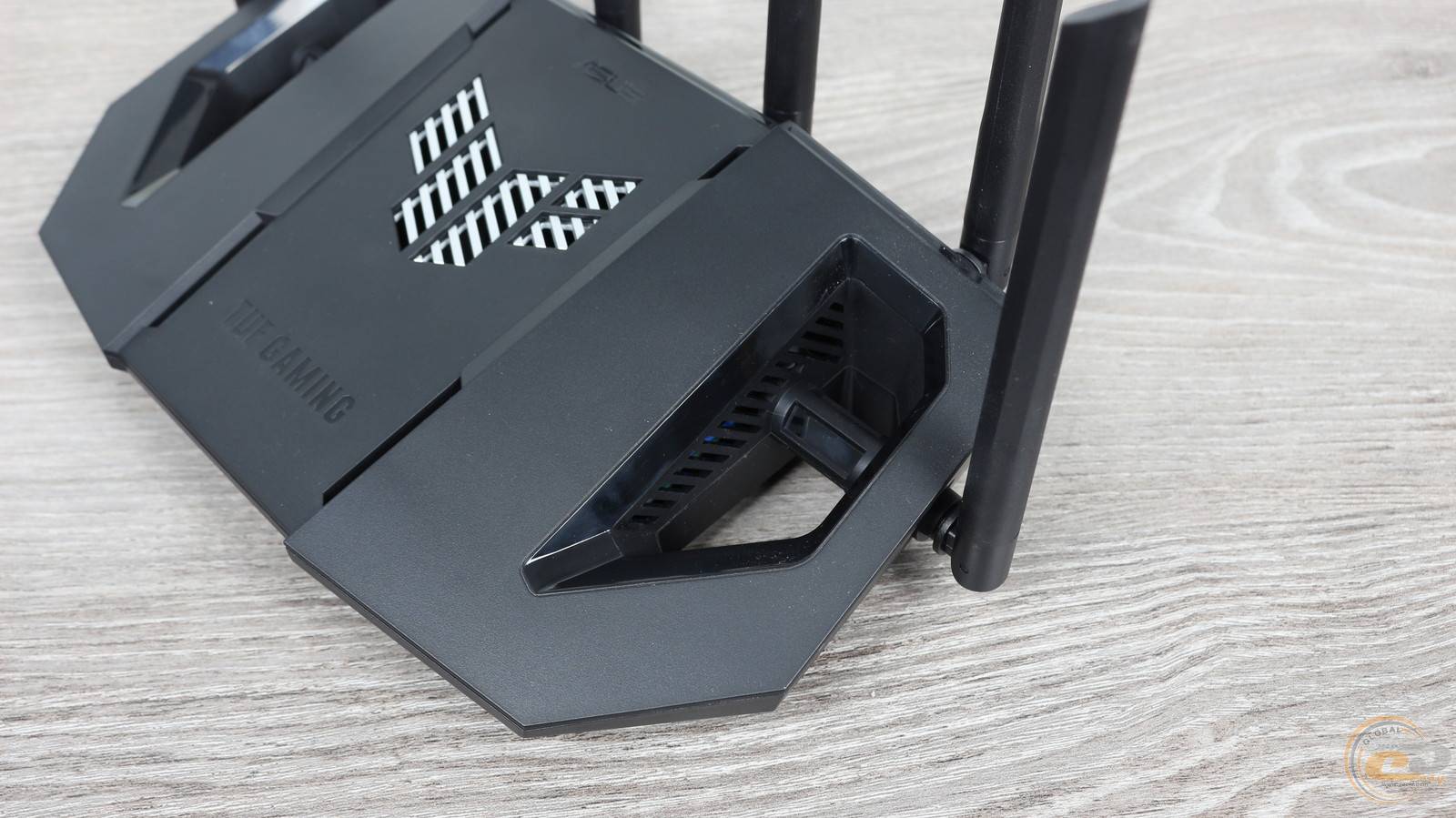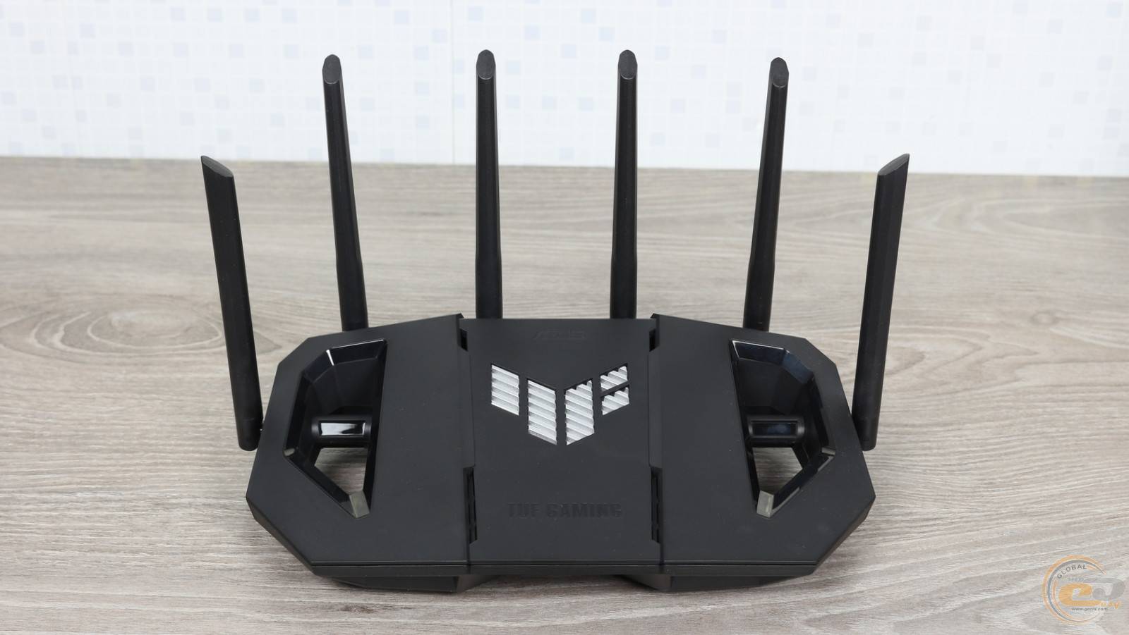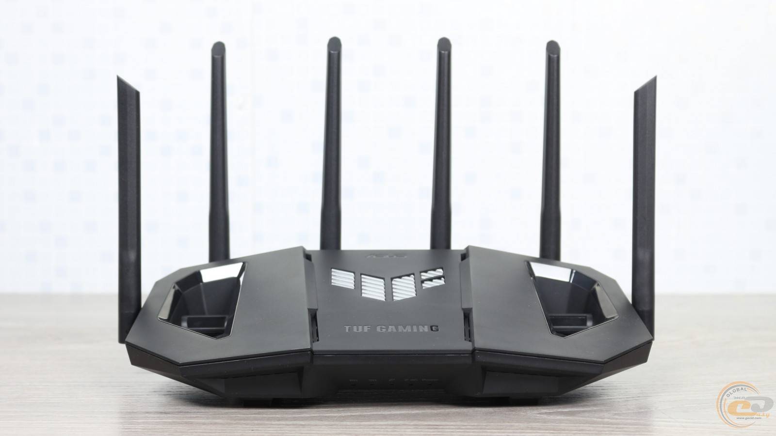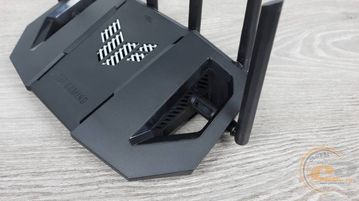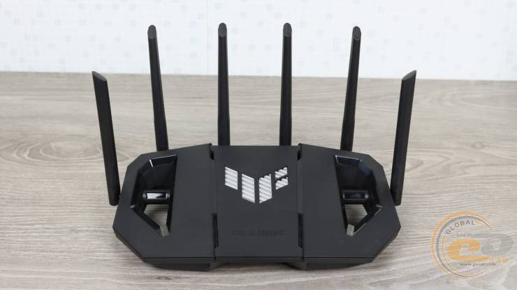 Дизайн ASUS TUF Gaming BE9400 дуже схожий на протестований нами раніше дводіапазонний ASUS TUF Gaming BE3600. Втім, новинка дещо підросла у габаритах (320 х 179 х 191 мм) та масі (764 г), а також отримала пару додаткових антен.