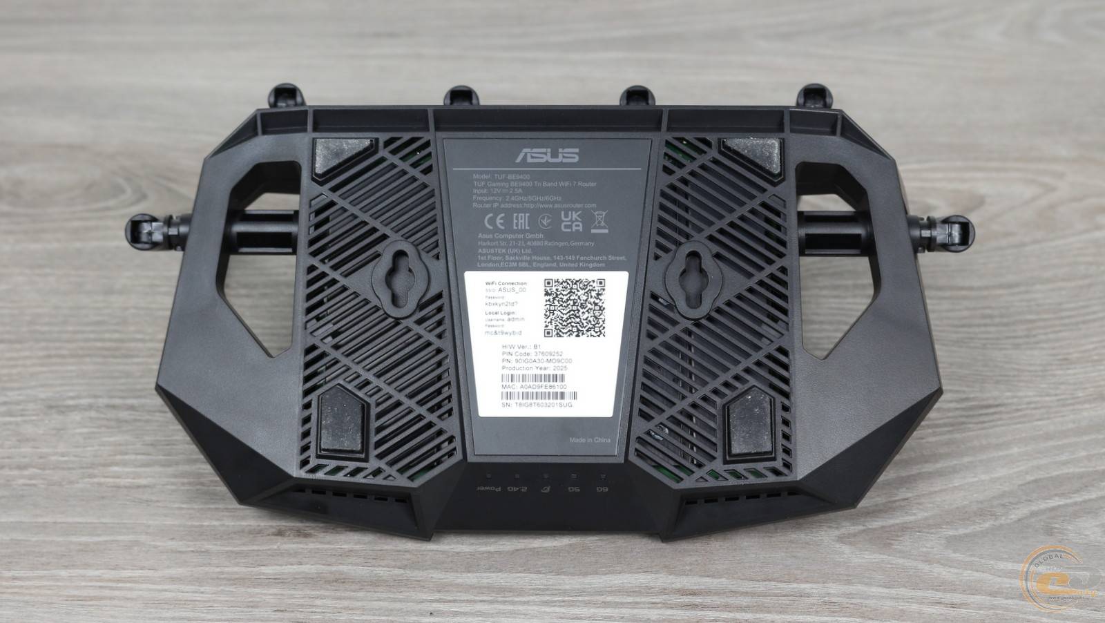 На нижній панелі роутера передбачено вдосталь вентиляційних прорізів, чотири м’які ніжки, пару отворів для настінного кріплення та наліпку з корисною інформацією — зокрема, даними для під’єднання до бездротової мережі.