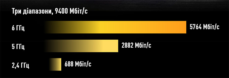 У діапазонах 2,4 та 5 ГГц максимальна швидкість передачі сягає відповідно 688 і 2882 Мбіт/с — це відповідає рівню моделі ASUS TUF Gaming BE3600. А за додаткові близько 40% вартості покупець отримує ще й третій 6-ГГц діапазон із пропускною здатністю цілих 5764 Мбіт/с.