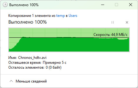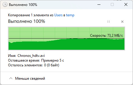 При передачі даних через порт USB 3.2 Gen 1 ми отримали 73 МБ/с при читанні та 45 МБ/с при записі. Це посередні результати, які у 1,5-2 рази поступаються дводіапазонному ASUS TUF Gaming BE3600. Ймовірно, свою роль відіграє менша частота процесора — 1,5 ГГц проти 2,0 ГГц у молодшої моделі. Втім, цього достатньо для створення FTP-сервера, хоча й не найшвидшого. Додатково USB-порт можна використовувати для під’єднання гаджета - як резервного джерела інтернет-трафіку.