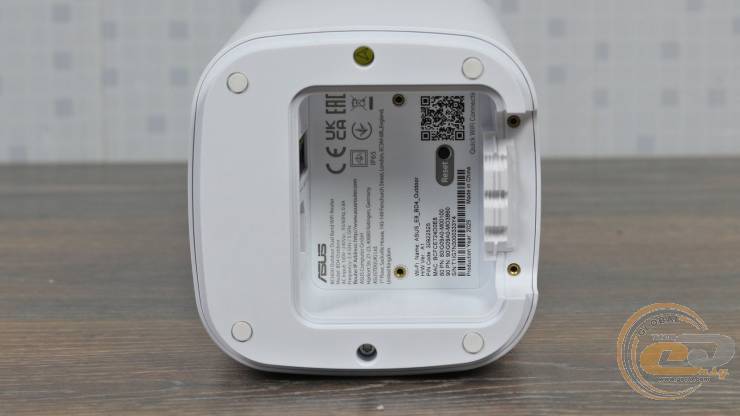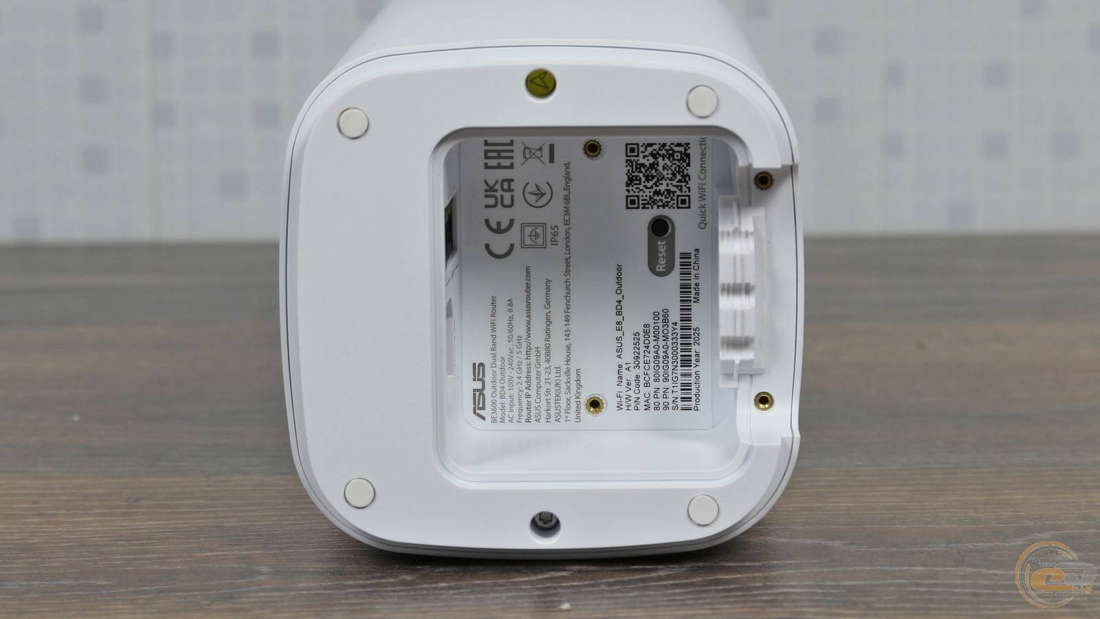 У заглибленні на нижній панелі розміщена наліпка з корисною інформацією, зокрема QR-кодом і паролем для під’єднання до встановленої «з коробки» Wi-Fi-мережі. Тут же прихована й єдина кнопка — Reset, призначена для скидання налаштувань.