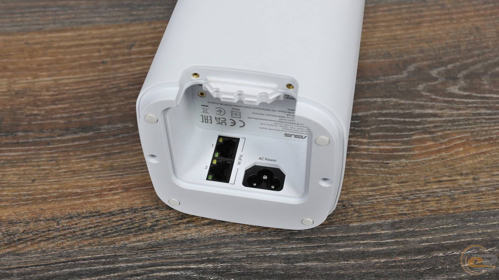 Поруч розташовані два мережеві роз’єми зі швидкістю 2,5 Гбіт/с та підтримкою живлення по Ethernet. Якщо ж PoE недоступне, можна скористатися окремим роз’ємом живлення та комплектним кабелем. ASUS ZenWiFi BD4 Outdoor підтримує підключення до електромереж у широкому діапазоні напруг — від 100 до 240 В.