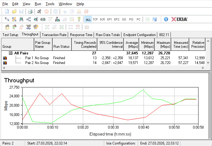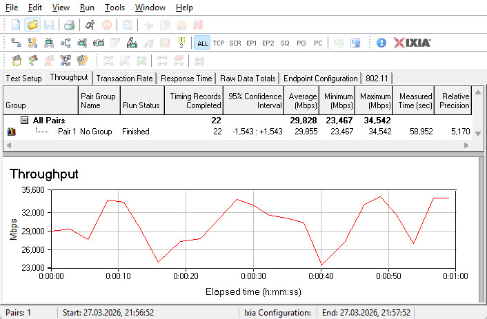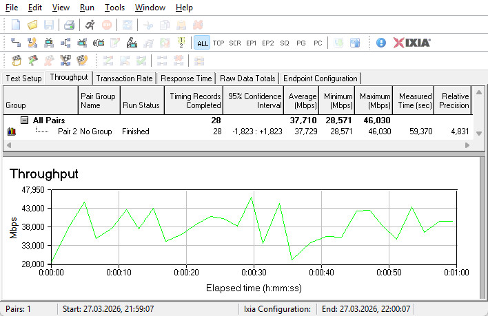 Утиліта Ixia Performance Test Tool показує середню швидкість передачі даних у двох напрямках на рівні 38 Мбіт/с. При цьому максимальне значення при завантаженні даних становило 46 Мбіт/с, а при відвантаженні — 35 Мбіт/с, що є цілком очікуваними показниками.