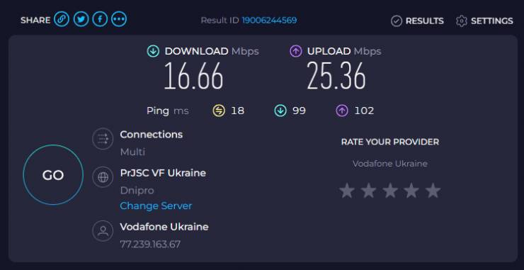 Тестування з SIM-картою оператора Vodafone через Speedtest.net показало дещо нижчі швидкості — 17 Мбіт/с на завантаження та 25 Мбіт/с на відвантаження. Втім, і цих значень вистачить для комфортного перегляду відео, вебсерфінгу та навіть завантаження не надто великих файлів.