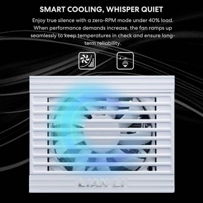 Для забезпечення тиші Lian Li обладнала блоки живлення 92-мм вентилятором FDB (гідродинамічний підшипник), який працює за інтелектуальною кривою. Вентилятор повністю зупиняється, якщо навантаження на блок живлення становить 40% або менше, усуваючи будь-який шум під час простою.