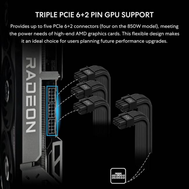 Блоки живлення серії SX створені для забезпечення стабільного живлення найновішого обладнання. Вони повністю відповідають специфікації Intel ATX 3.1 та оснащені фірмовим роз'ємом PCIe Gen 5.1 12V-2x6. Цей роз'єм здатний видавати до 600 Вт потужності безпосередньо на сучасні графічні процесори, усуваючи необхідність у незручних адаптерах. Для більшої універсальності, моделі на 1000 Вт та 1200 Вт також комплектуються кабелем 12V-2x6 з двома роз'ємами 6+2 pin PCIe.