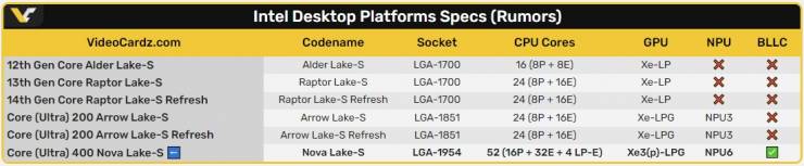 Це покоління охоплюватиме різні формфактори, включно з настільними комп’ютерами. Для десктопів готується «Nova Lake‑S» на новій платформі Socket LGA1954, яка замінить поточний LGA1851. У рамках підготовки Intel ще цього року випустить «Arrow Lake Refresh» для LGA1851.