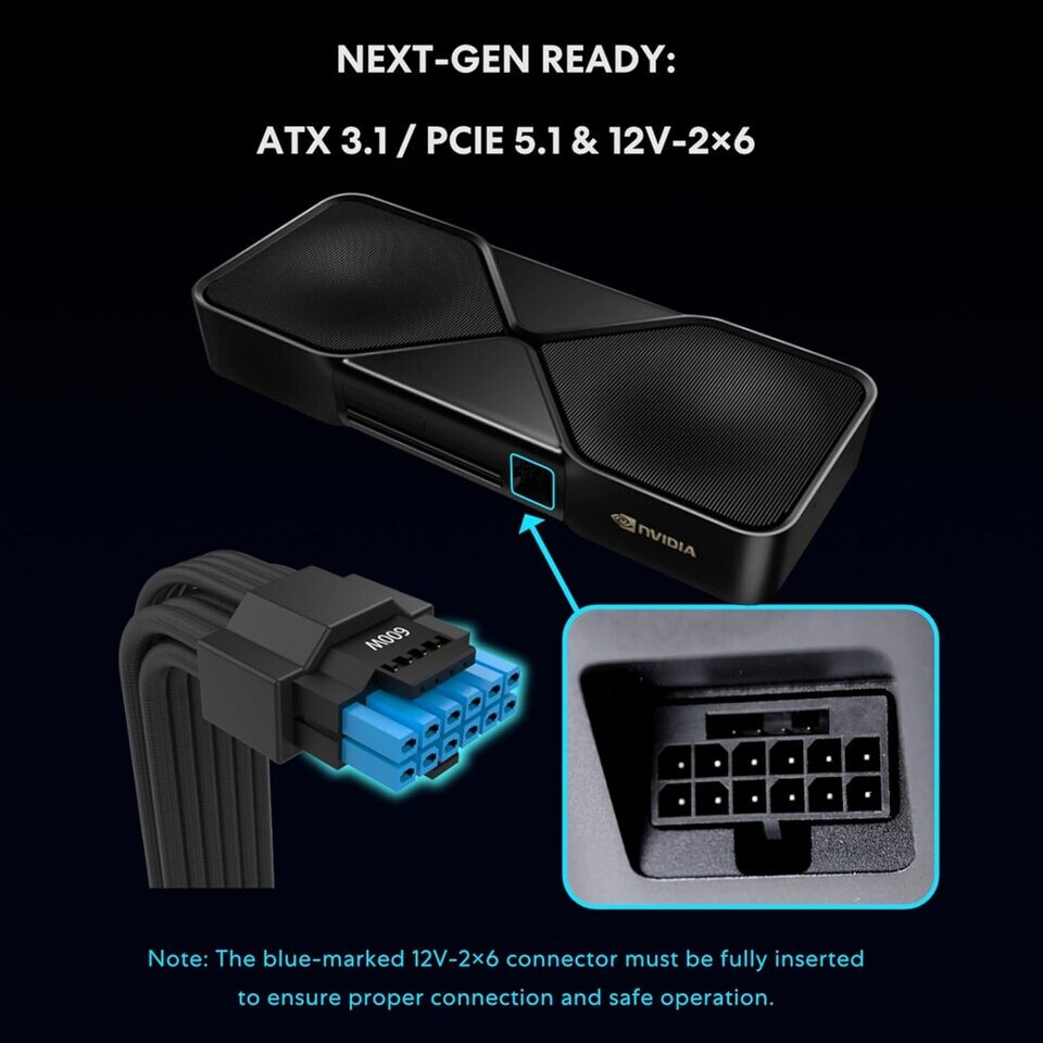 Блоки живлення серії SX створені для забезпечення стабільного живлення найновішого обладнання. Вони повністю відповідають специфікації Intel ATX 3.1 та оснащені фірмовим роз'ємом PCIe Gen 5.1 12V-2x6. Цей роз'єм здатний видавати до 600 Вт потужності безпосередньо на сучасні графічні процесори, усуваючи необхідність у незручних адаптерах. Для більшої універсальності, моделі на 1000 Вт та 1200 Вт також комплектуються кабелем 12V-2x6 з двома роз'ємами 6+2 pin PCIe.