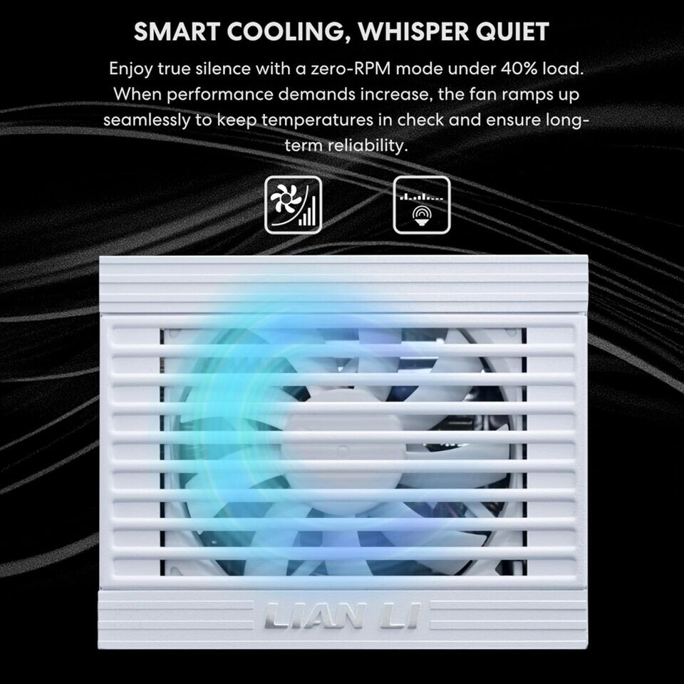 Для забезпечення тиші Lian Li обладнала блоки живлення 92-мм вентилятором FDB (гідродинамічний підшипник), який працює за інтелектуальною кривою. Вентилятор повністю зупиняється, якщо навантаження на блок живлення становить 40% або менше, усуваючи будь-який шум під час простою.
