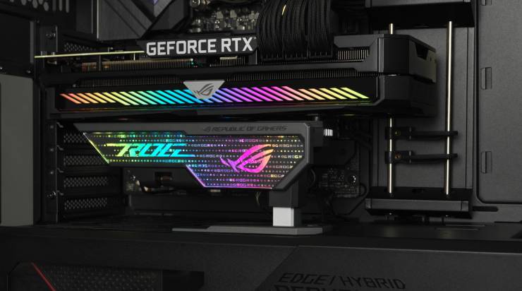 ASUS впровадила цю функцію через значні габарити та масу сучасних відеокарт, як-от ROG Astral GeForce RTX 5090. Масивні системи охолодження важать кілька кілограмів, що створює серйозне навантаження на слот PCIe та текстоліт.