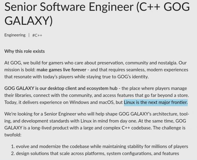 Стало відомо, що вона планує впровадити офіційну підтримку Linux для свого клієнта GOG Galaxy. Про це свідчить нова вакансія старшого інженера-програміста на C++, який має допомогти у формуванні архітектури та інструментів розробки з урахуванням особливостей Linux «з першого дня».