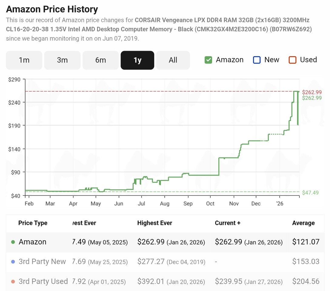 У споживчому секторі ситуація виглядає ще критичнішою. За останні шість місяців вартість популярного комплекту Corsair Vengeance LPX DDR4-3200 об'ємом 32 ГБ злетіла з мінімальних 71,99 долара США до неймовірних 262,99 долара США.