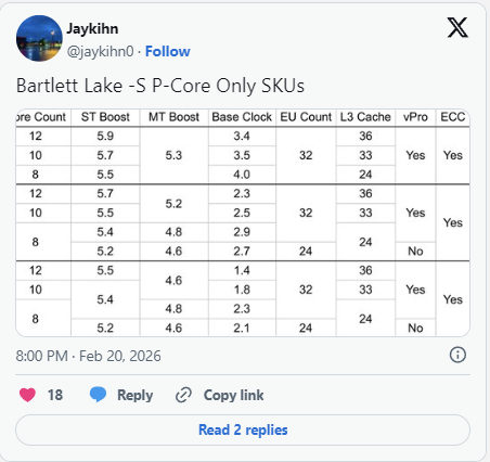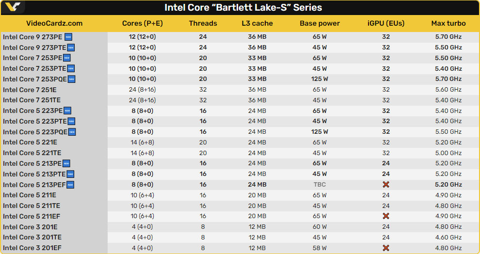 Відомий інсайдер Jaykihn опублікував повну таблицю специфікацій процесорів Intel Core 200E Bartlett Lake‑S, які базуються виключно на продуктивних ядрах (P‑cores).