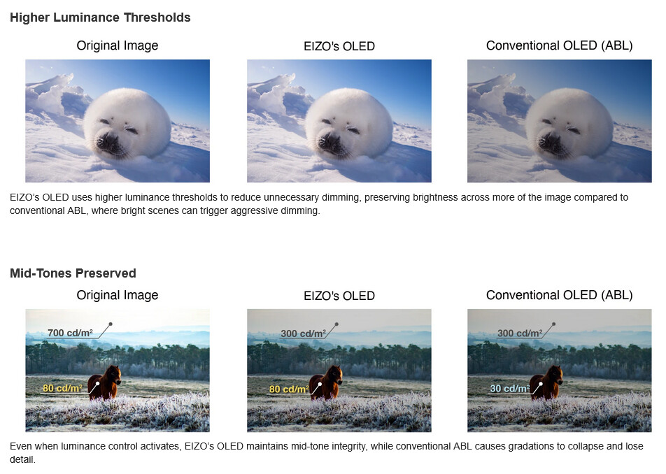 IPS‑панель забезпечує яскравість 300 ніт, контрастність 1000:1 та охоплення 99% sRGB. Час відгуку становить 5 мс, але в екстремальному режимі його можна знизити до 0,5 мс. Монітори підтримують AMD FreeSync Premium.