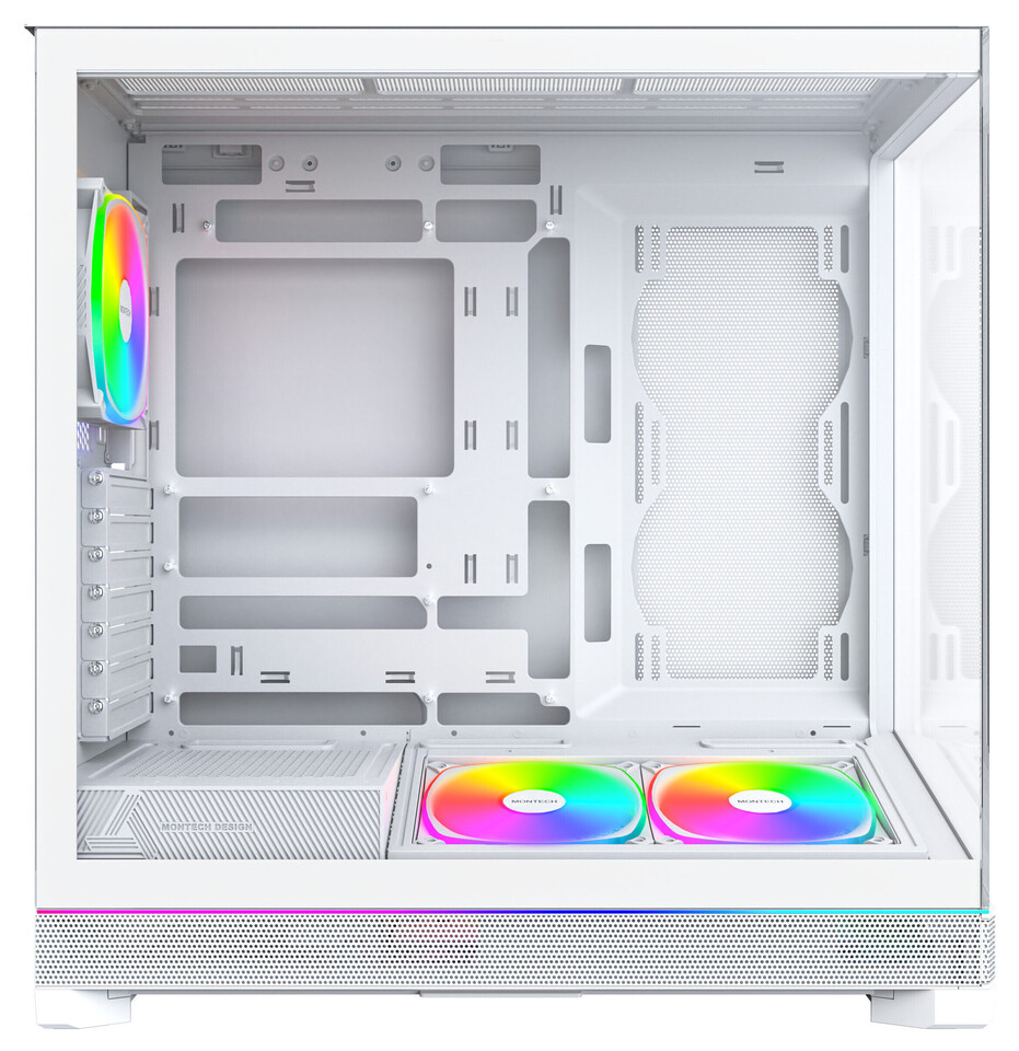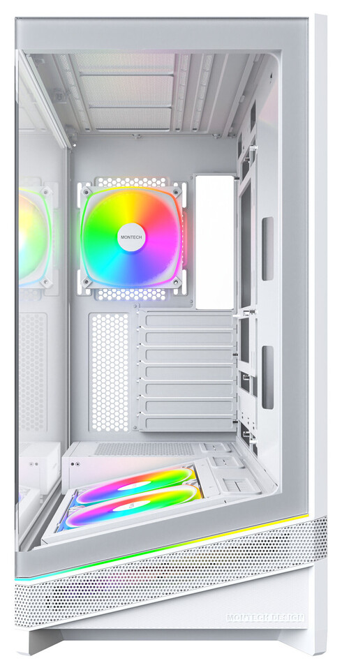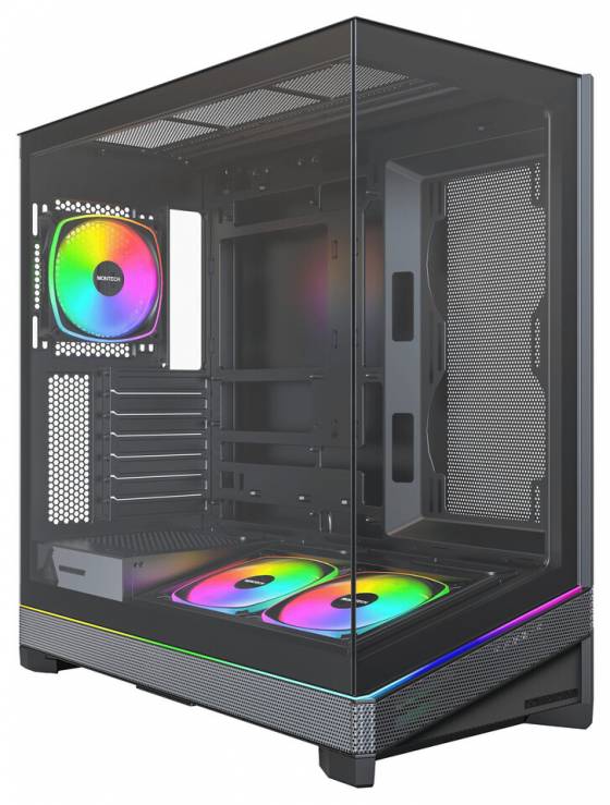 Корпус розроблений із запасом для майбутніх відеокарт серії RTX 50, підтримує збільшену довжину та товщину GPU, а також сумісний із материнськими платами із зворотним підключенням, такими як ASUS BTF, MSI Project Zero та Gigabyte Project STEALTH. У комплекті йдуть нові вентилятори Montech AX120 PRO та RX120 PRO з ARGB‑підсвічуванням, які забезпечують ефективний повітряний потік одразу після встановлення.