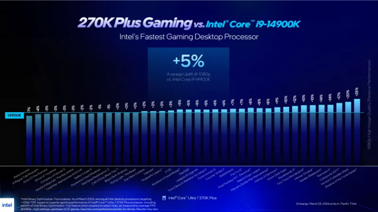 Водночас компанія заявляє, що за результатами 37 внутрішніх тестів Core Ultra 7 270K Plus у середньому на 5 % швидший за Core i9‑14900K у роздільній здатності 1080p.