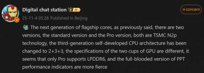 Згідно з інформацією, опублікованою DCS на Weibo, обидва нові мобільні процесори використовуватимуть ту саму архітектуру третього покоління і будуть виготовлені за передовим виробничим процесом TSMC N2P.
