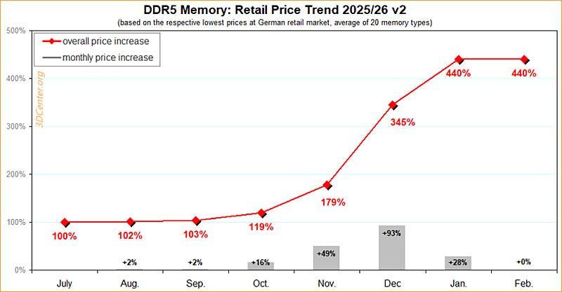У лютому аналітики зафіксували різкий контраст на ринку пам’яті: ціни на модулі DDR5 для настільних ПК у Німеччині зупинили своє зростання й залишилися на рівні січня.