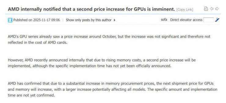 У публікаціях на форумі Chinese Board Channels стверджується, що AMD повідомила партнерам, що ціни на пам'ять зросли настільки, що наступна хвиля графічних процесорів постачатиметься за вищими цінами. Перше підвищення цін, яке відбулося ще в жовтні, було невеликим і так і не з'явилося в роздрібній торгівлі, але це нове підвищення, як кажуть, буде більшим і стосуватиметься всіх моделей, починаючи від ігрових відеокарт Radeon і закінчуючи графічними процесорами для робочих станцій та компонентів штучного інтелекту.