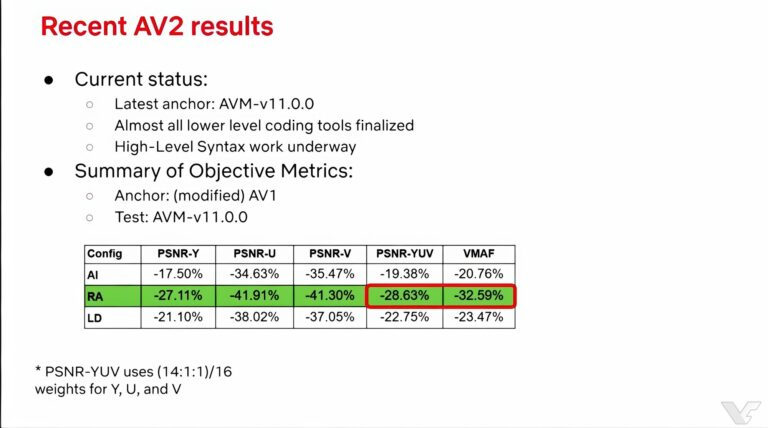 Наразі кодек демонструє значне зниження бітрейту — приблизно на 30% порівняно з поточним стандартом AV1 за збереження тієї ж якості зображення.