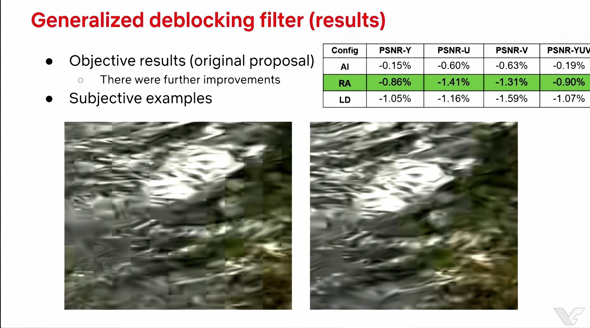- Перетворення та фільтрація: Система перетворення використовує вивчені та кроскомпонентні перетворення для кращого збереження текстури. Постобробка покращена завдяки єдиному узагальненому деблокеру, а також новим фільтрам, як-от Guided Detail Filter та Cross-Component Sample Offset, для очищення шуму стиснення.