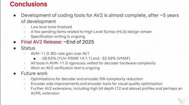 Усі інструменти AV2 вже пройшли перевірку на апаратну ефективність. Наступною метою AOM є оптимізація кодера та потенційні розширення для більшої бітової глибини та профілів за допомогою штучного інтелекту.