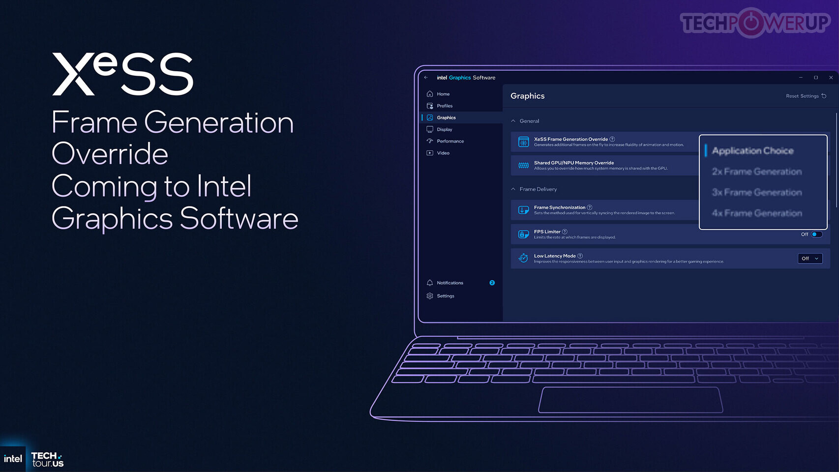 Нова функція генерації кадрів XeSS 3 з'явиться як опція в застосунку Intel Graphics Software. Користувачі зможуть вибирати між режимами генерації кадрів: 2×, 3× та 4×.