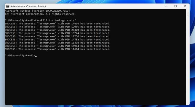 - Видалення всіх екземплярів: Якщо у фоновому режимі вже накопичилося багато дублювальних процесів, їх можна одночасно видалити за допомогою Командного рядка (CMD). Для цього потрібно запустити CMD від імені адміністратора та ввести команду: taskkill /im taskmgr.exe /f