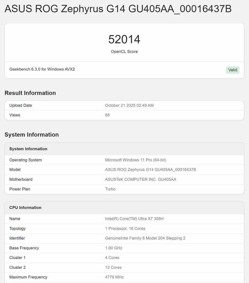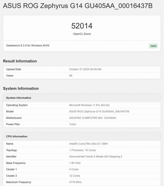 - OpenCL Score: Вбудований графічний процесор (iGPU) набрав 52 014 балів у тесті OpenCL.