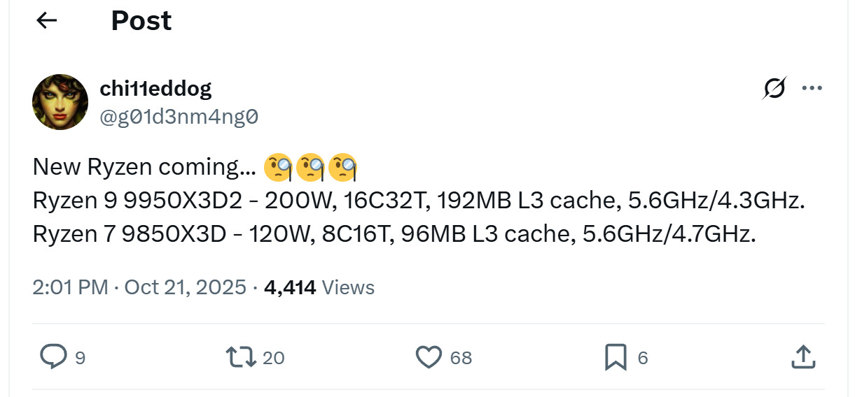 AMD може випустити 16-ядерний процесор Ryzen 9 9950X3D2 зі 192 МБ кешу L3 та TDP 200 Вт