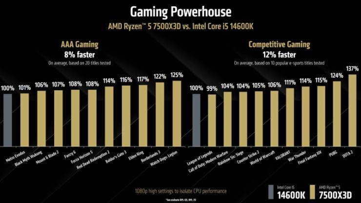 AMD позиціонує Ryzen 5 7500X3D як прямого конкурента Core i5-14600K та Core Ultra 5 245KF. Згідно з внутрішніми тестами AMD, її новий процесор в середньому швидший за Core Ultra 5 245KF на 22% у змагальних іграх (з розривом до 42% у PUBG) та на 13% швидший у AAA-іграх. Відносно Core i5-14600K перевага становить 8–12%.
